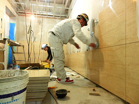 3階のエレベーターホールでは床と壁のタイルを張っていました。