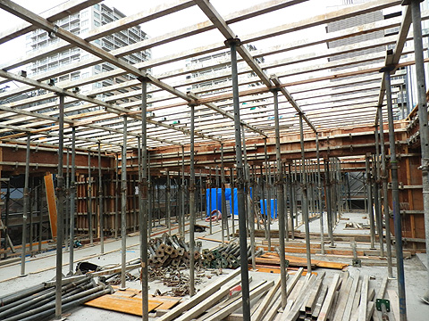 型枠のサポート(写真のつっかい棒状のもの)の施工状況を見ていると