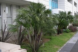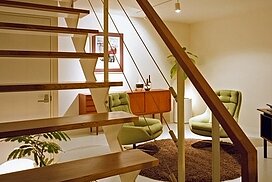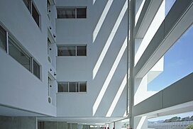 ひとつ目は1~2階のメゾネット住戸。このメゾネット住戸は共用のエントランスを通過せずに前面の歩道から直接アクセスできるようにしている。共同住宅の中にあって戸建て感覚のスタイルを取っている。気になるプライバシーの問題はセットバックした部分の植栽と歩道との高低差により解消している。