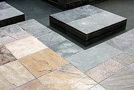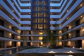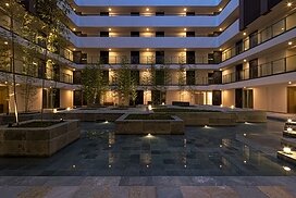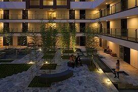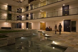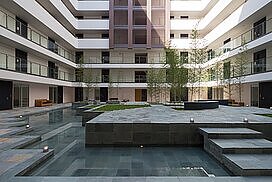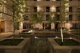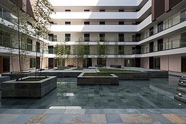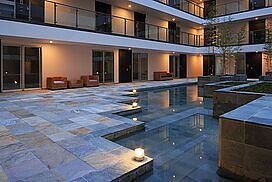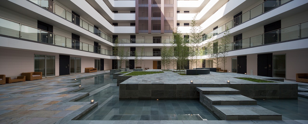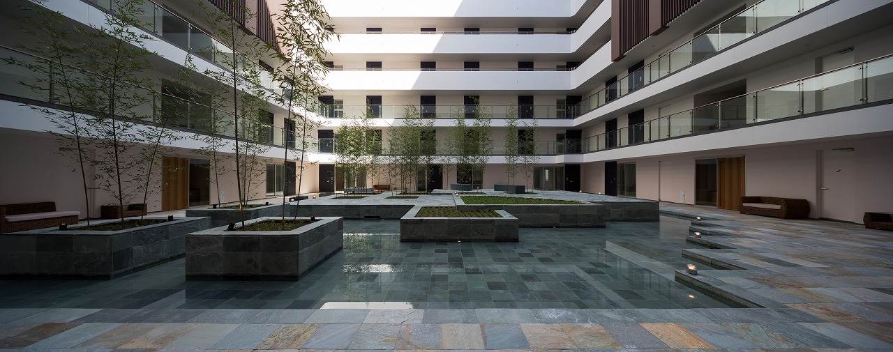 水盤のあるパティオを囲むロの字型の集合住宅。