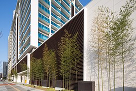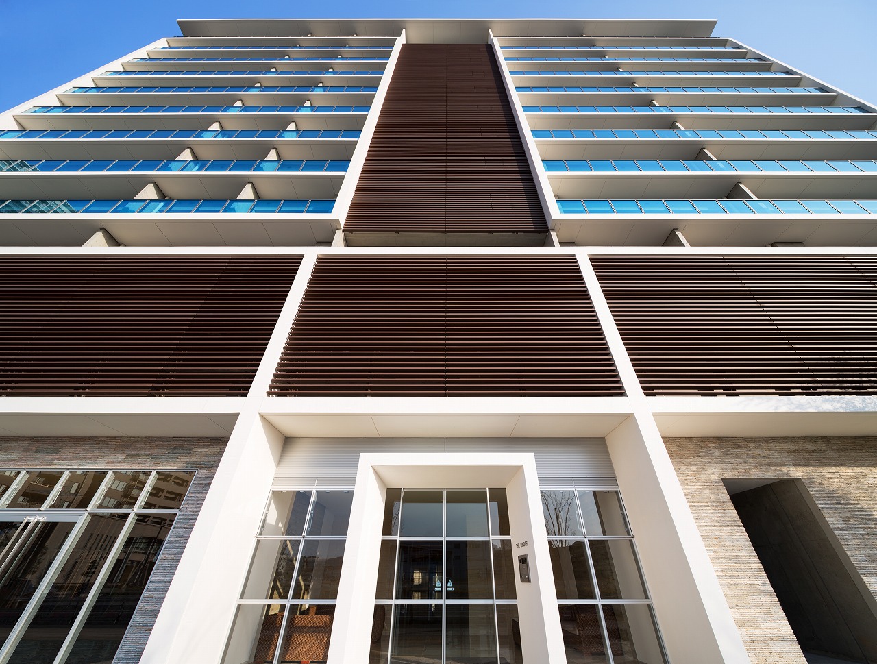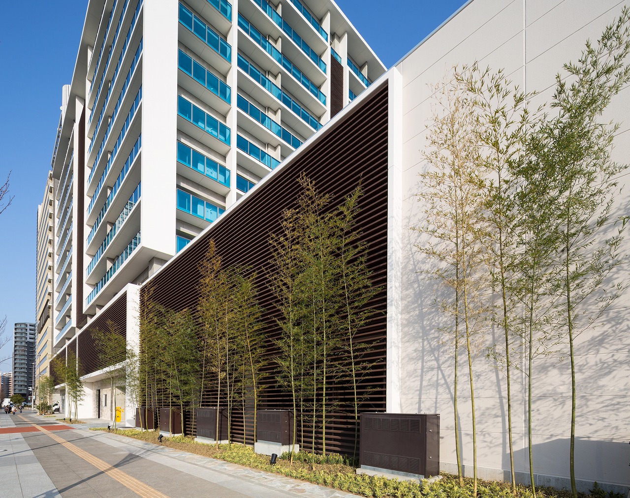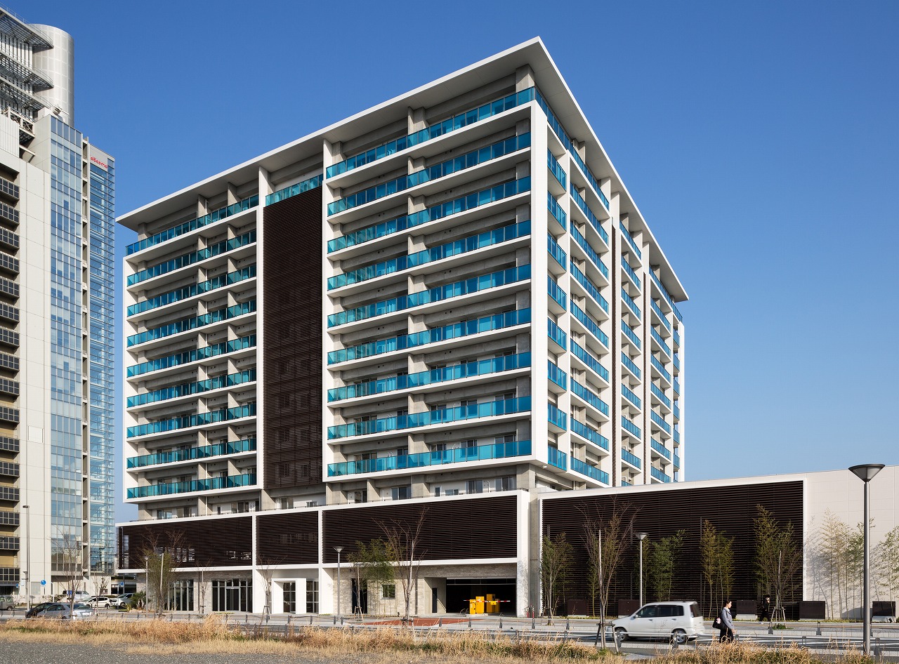 千早駅から望めば一目でLINNGROVEと兄弟的デザインとわかるTHE LINDOS。しかしコンセプトは全く別物で、LINNGROVEが中廊下型、約100mの板状であったのに対し、THE LINDOSはパティオを囲むロの字型になっている。外観からはこの建物の3階中央に一辺25m四方の10層吹抜空間となるパティオがあるとはイメージできないであろう。
