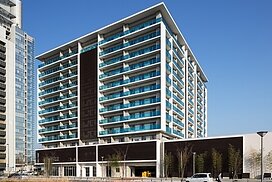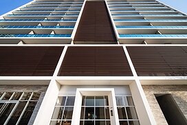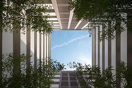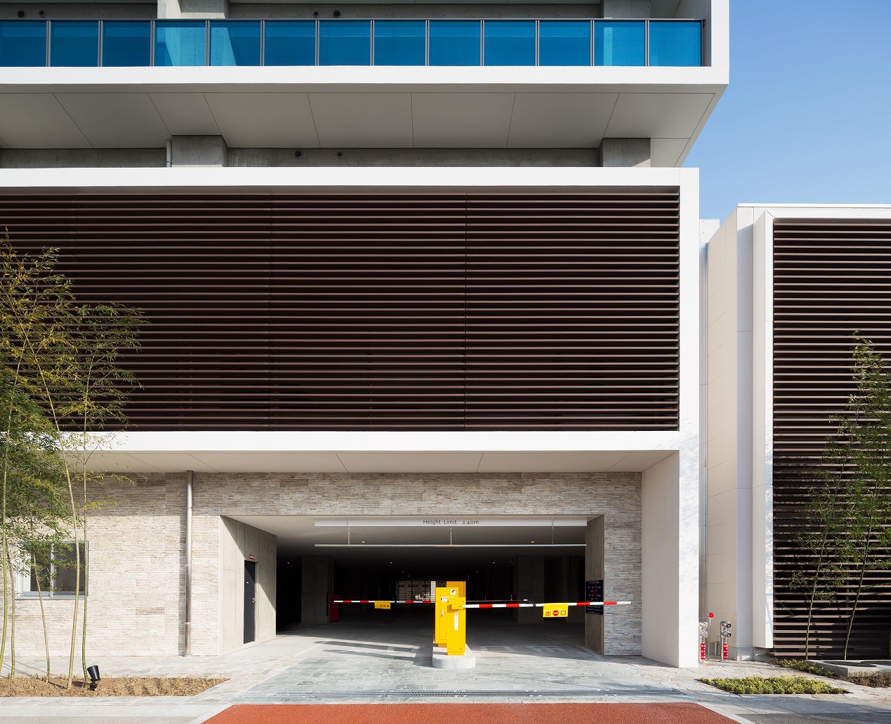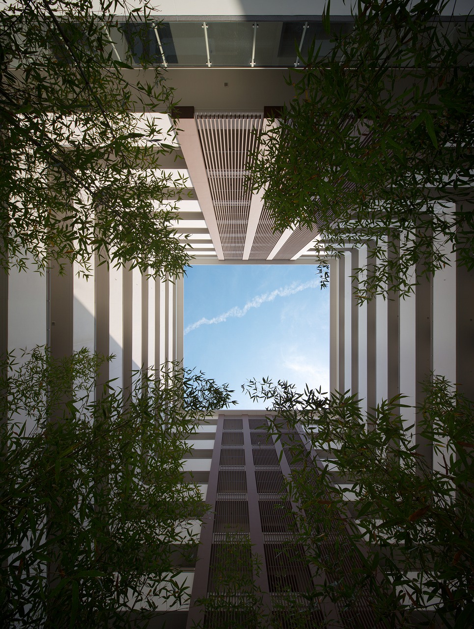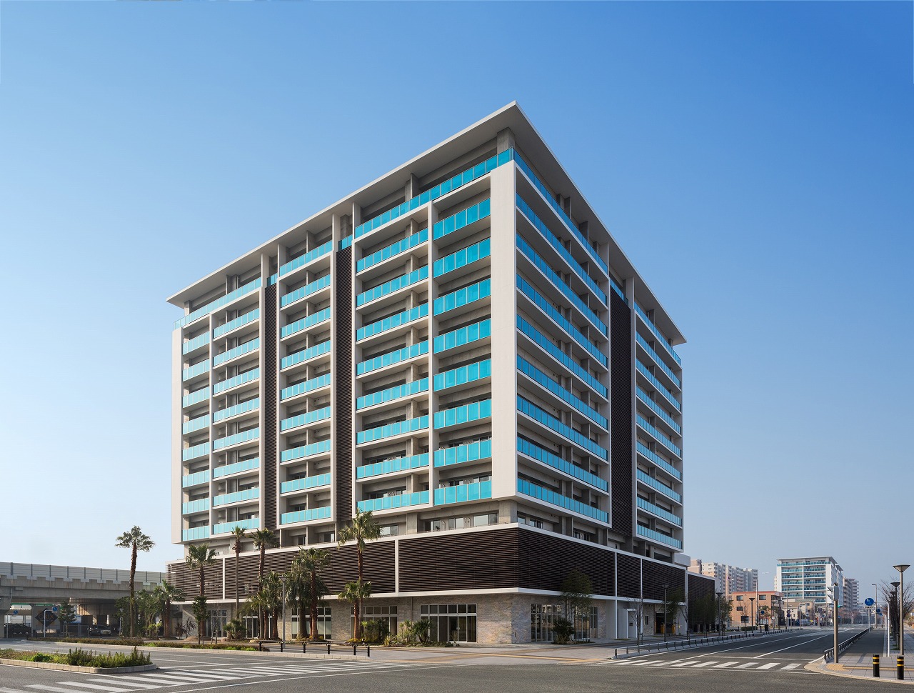 千早駅から望めば一目でLINNGROVEと兄弟的デザインとわかるTHE LINDOS。しかしコンセプトは全く別物で、LINNGROVEが中廊下型、約100mの板状であったのに対し、THE LINDOSはパティオを囲むロの字型になっている。外観からはこの建物の3階中央に一辺25m四方の10層吹抜空間となるパティオがあるとはイメージできないであろう。