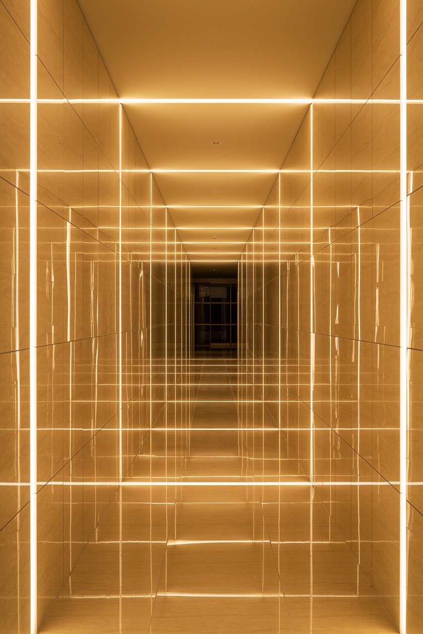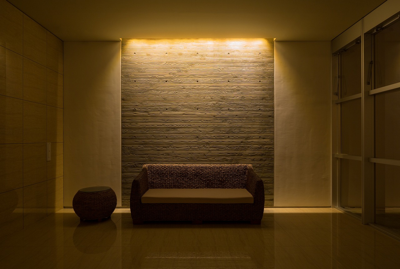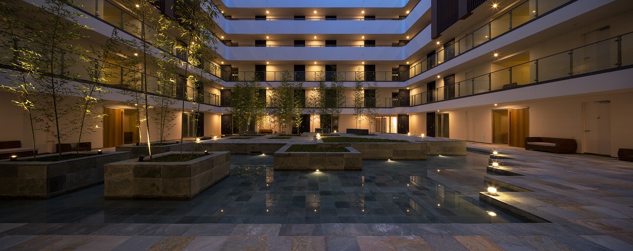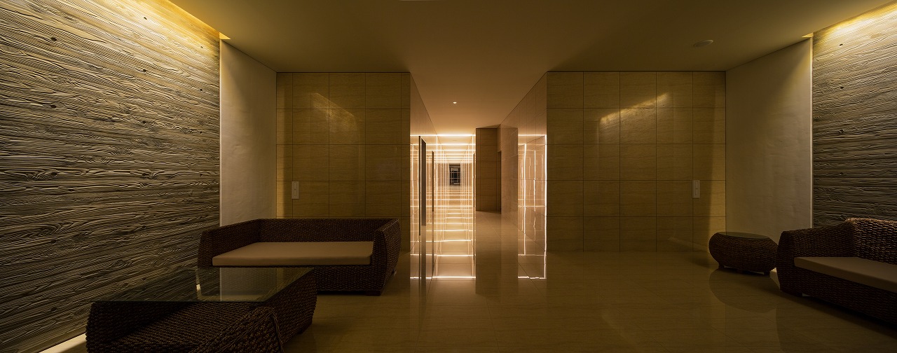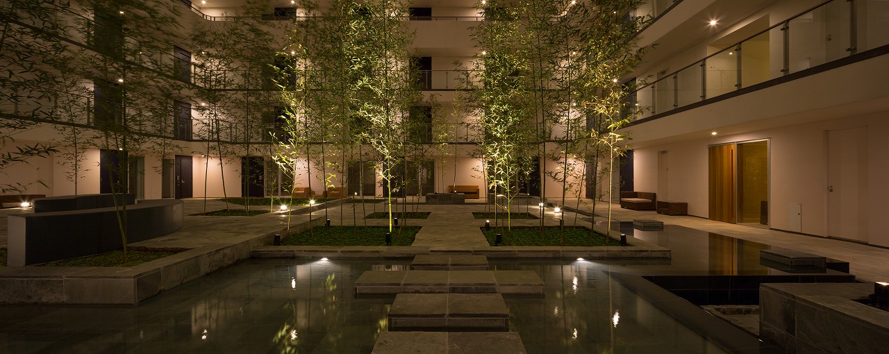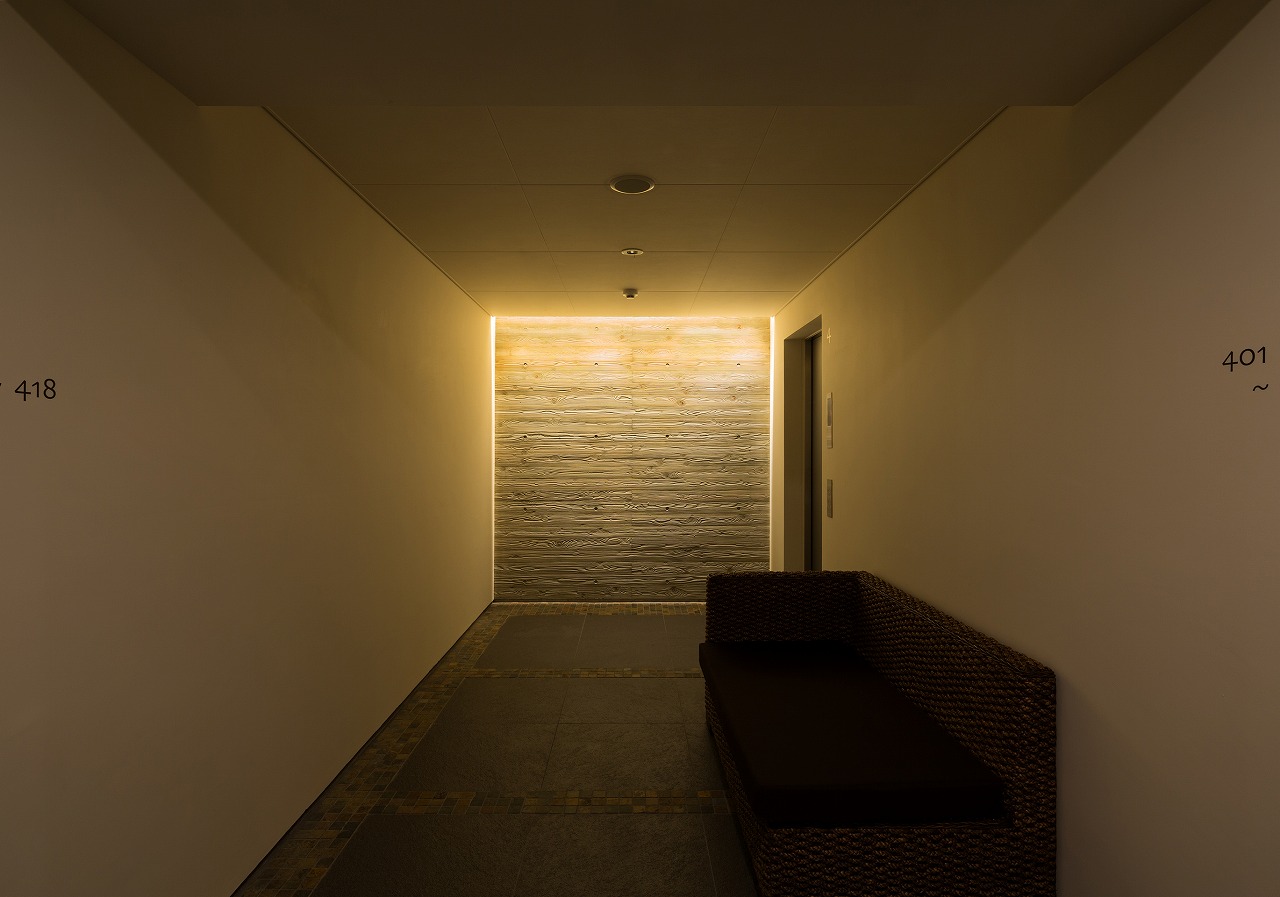 また、この建物には随所に仕掛けを施している。先程からふれている水盤のあるパティオはその筆頭に挙げられるが、特に光による演出に力をいれている。ふたつあるエントランスホールをつなぐ渡り廊下から始まり、パティオの水中照明、各階エレベーターホール…。夕方から日暮れの間の表情の変化はリゾートホテルを思わせる空間になっている。
