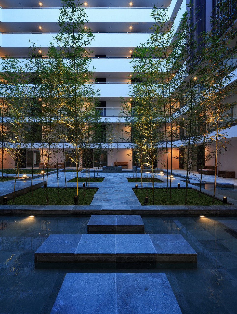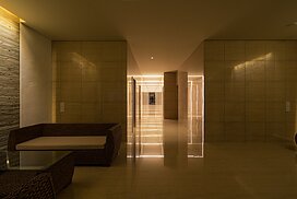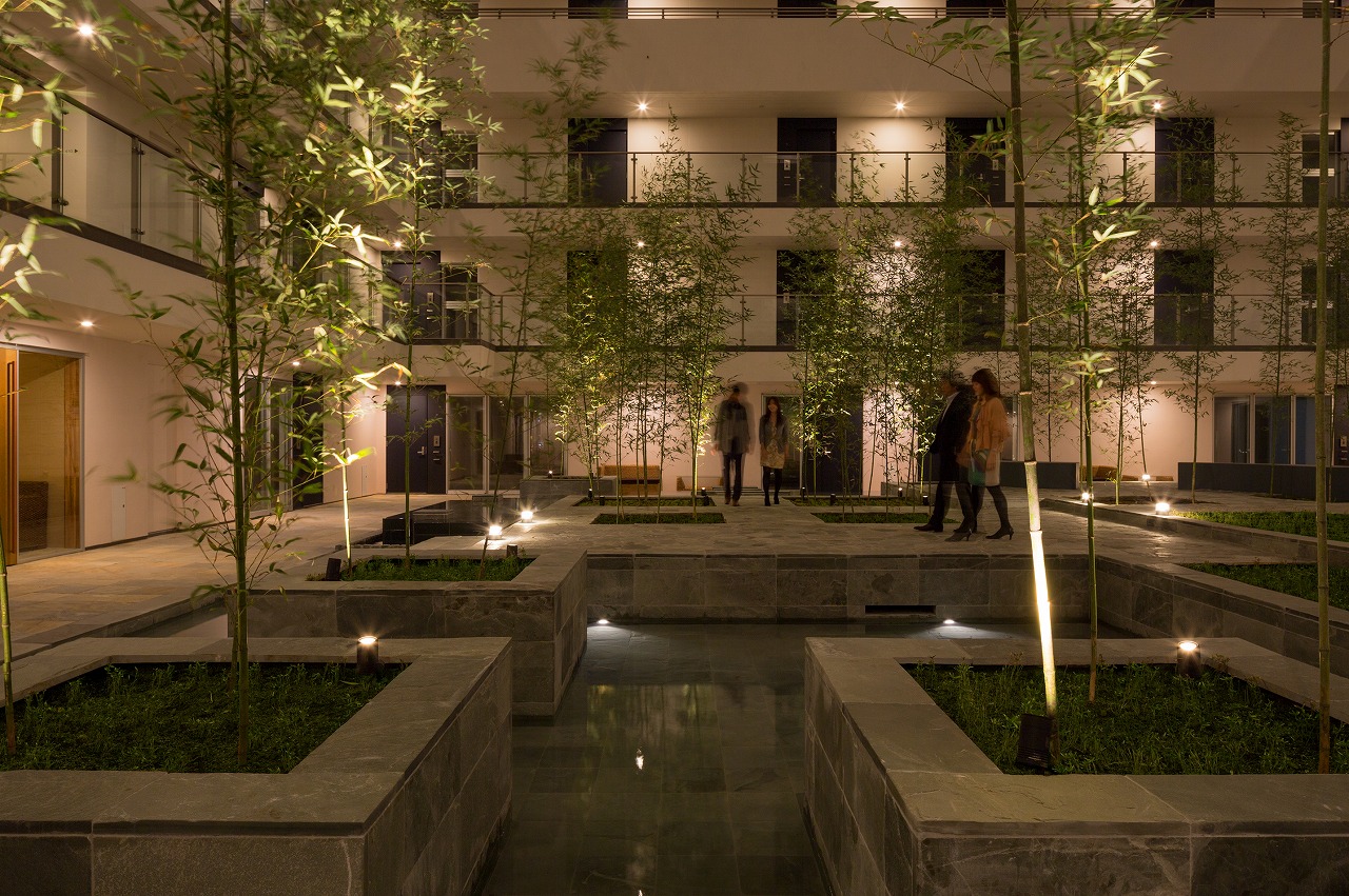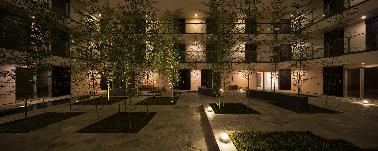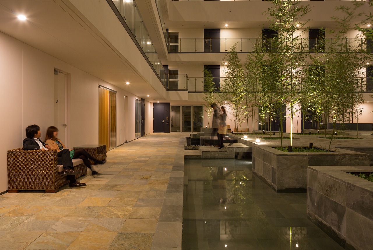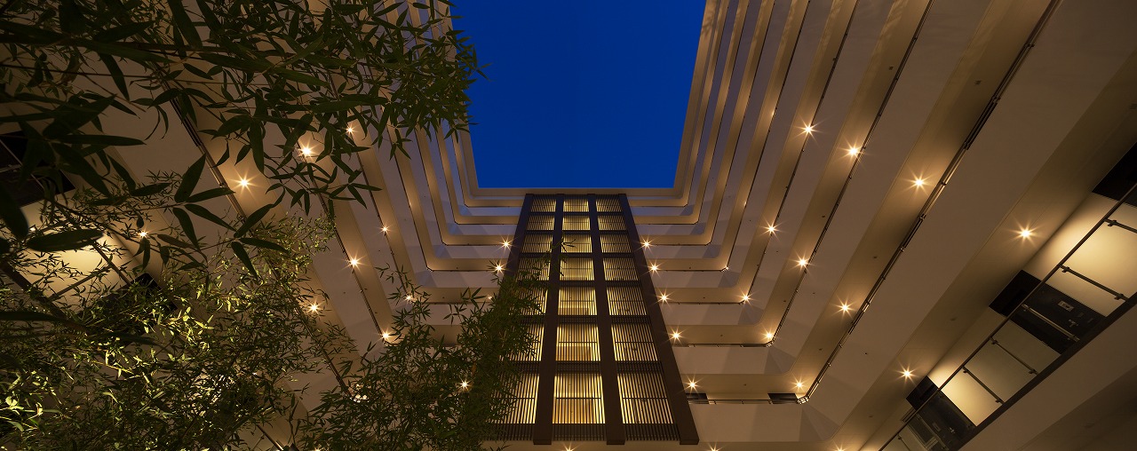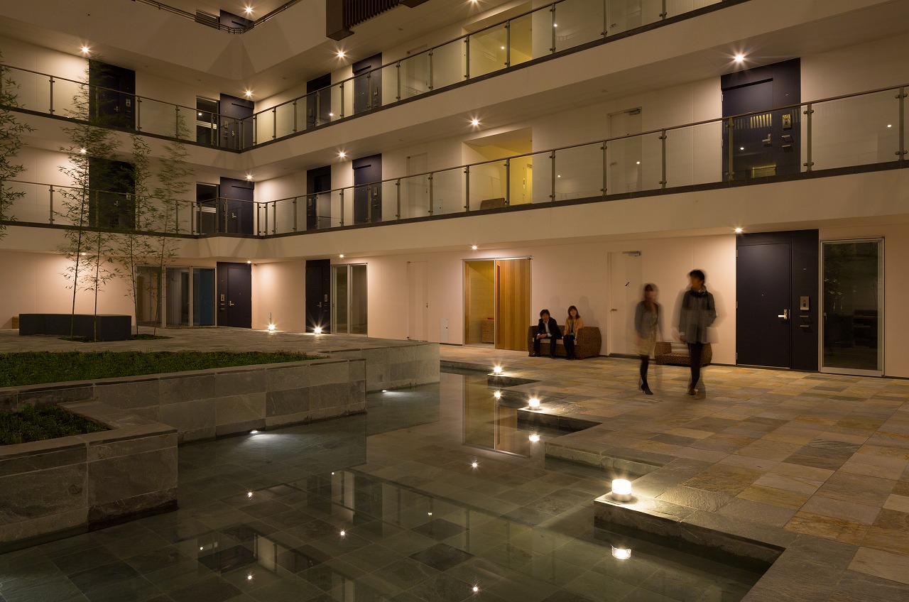 また、この建物には随所に仕掛けを施している。先程からふれている水盤のあるパティオはその筆頭に挙げられるが、特に光による演出に力をいれている。ふたつあるエントランスホールをつなぐ渡り廊下から始まり、パティオの水中照明、各階エレベーターホール…。夕方から日暮れの間の表情の変化はリゾートホテルを思わせる空間になっている。