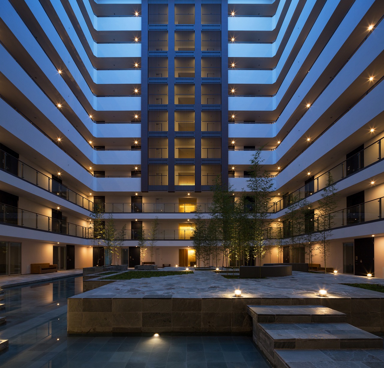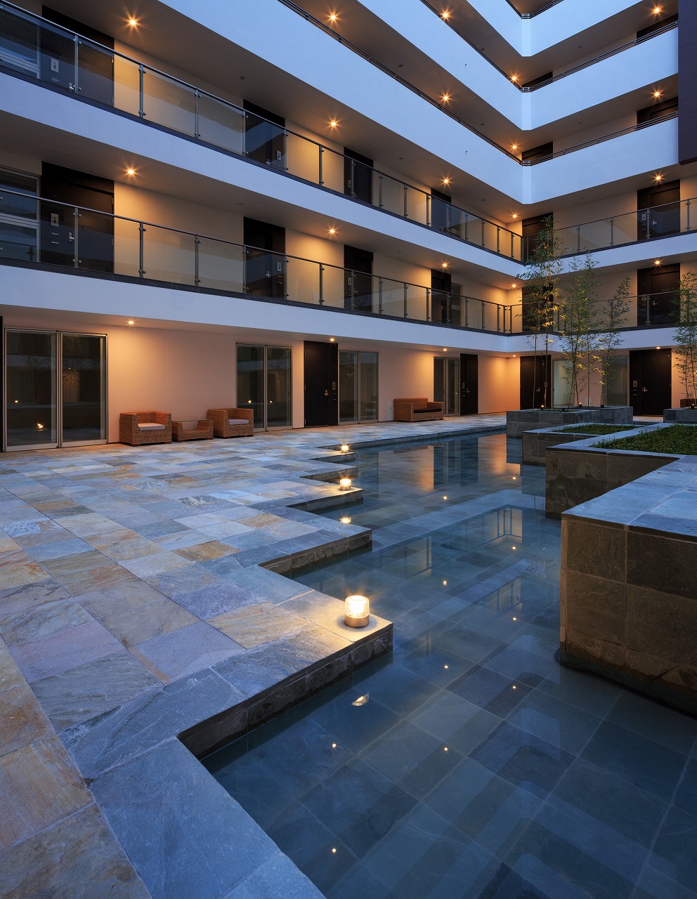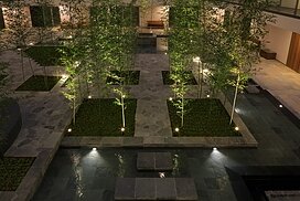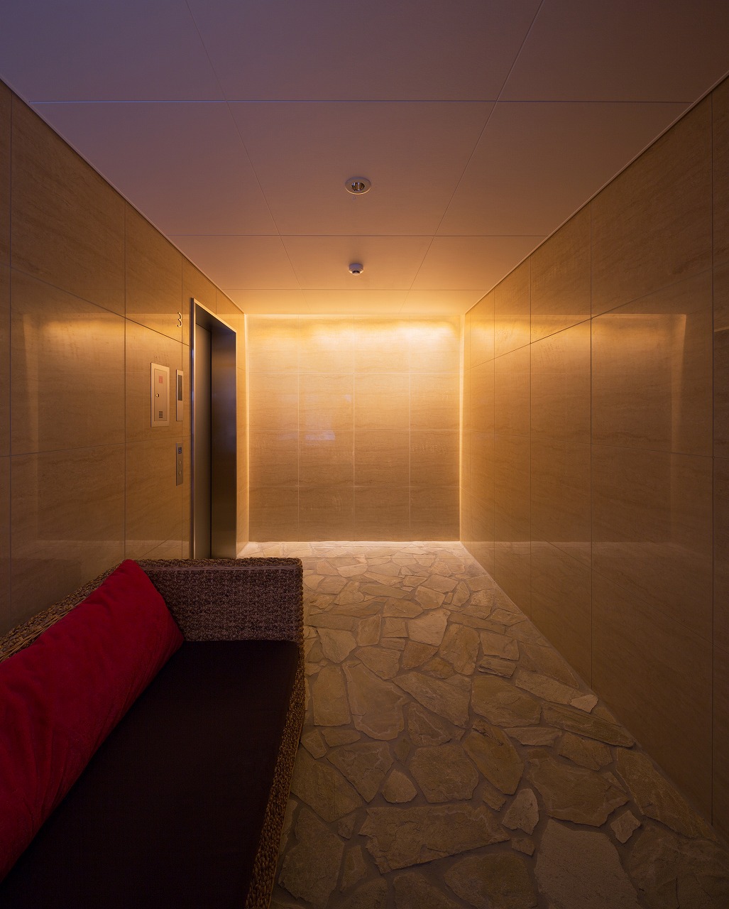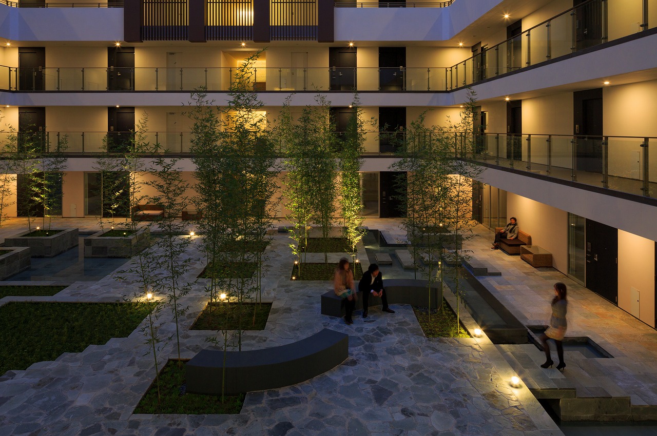 また、この建物には随所に仕掛けを施している。先程からふれている水盤のあるパティオはその筆頭に挙げられるが、特に光による演出に力をいれている。ふたつあるエントランスホールをつなぐ渡り廊下から始まり、パティオの水中照明、各階エレベーターホール…。夕方から日暮れの間の表情の変化はリゾートホテルを思わせる空間になっている。