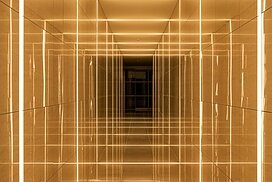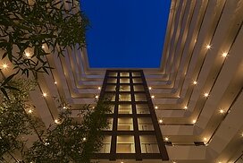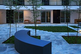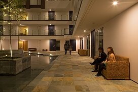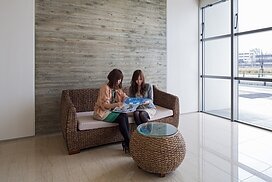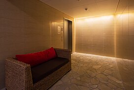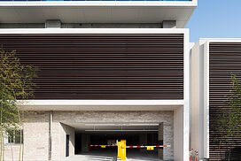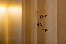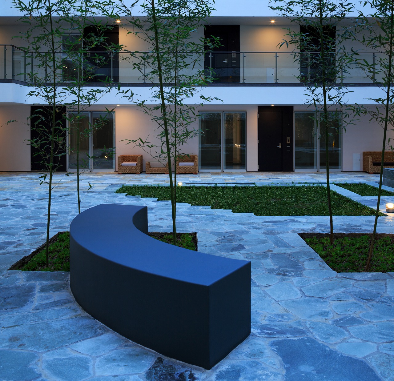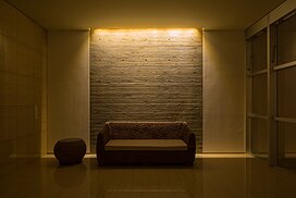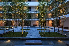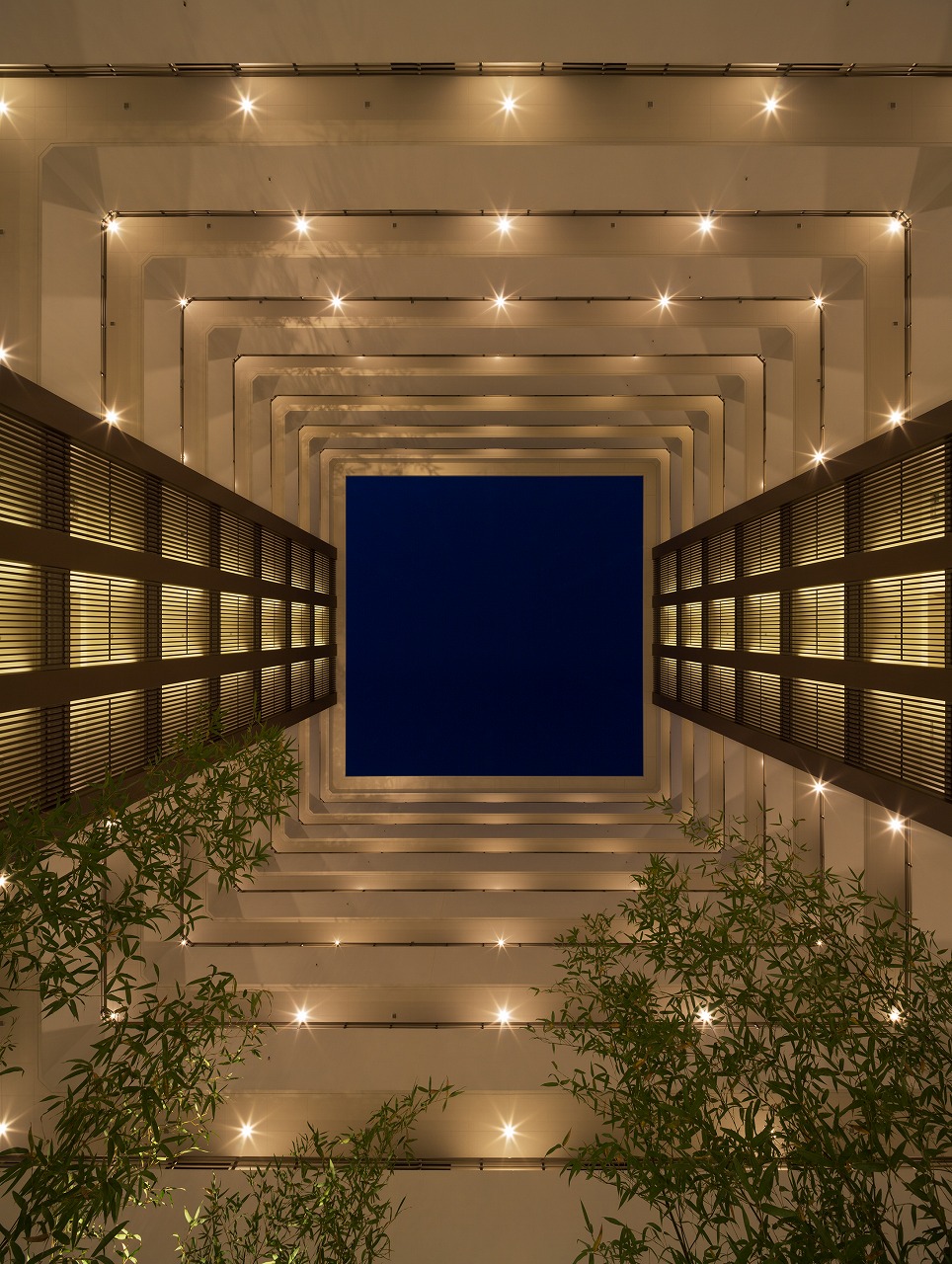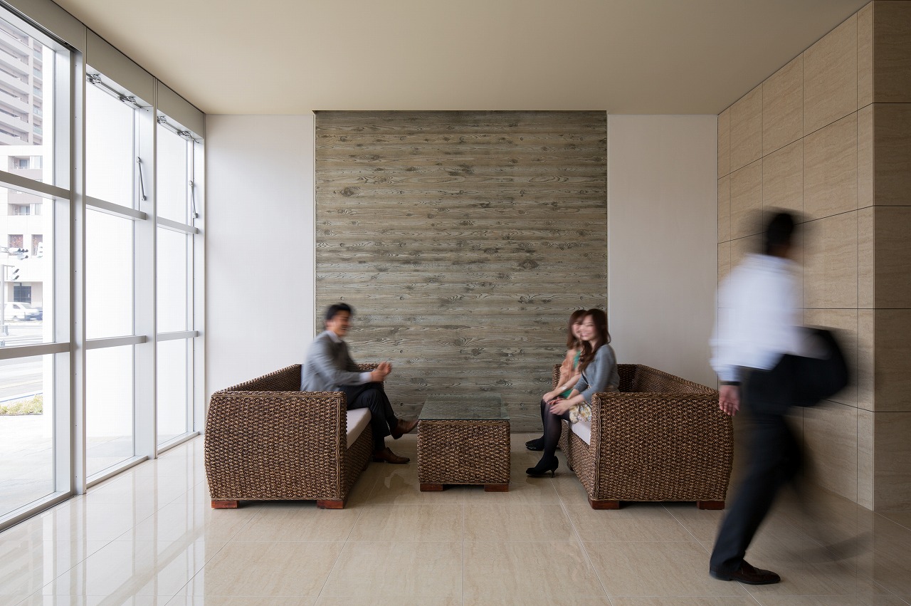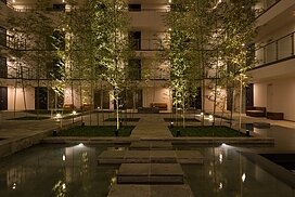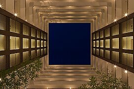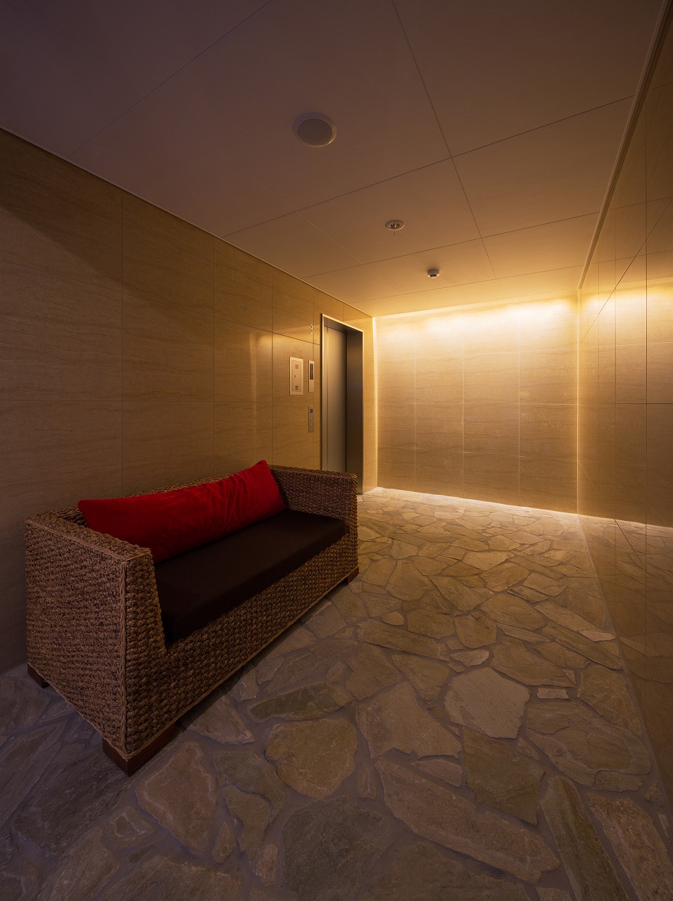 また、この建物には随所に仕掛けを施している。先程からふれている水盤のあるパティオはその筆頭に挙げられるが、特に光による演出に力をいれている。ふたつあるエントランスホールをつなぐ渡り廊下から始まり、パティオの水中照明、各階エレベーターホール…。夕方から日暮れの間の表情の変化はリゾートホテルを思わせる空間になっている。