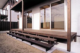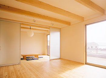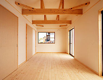 内部:ファミリーゾーン、プライベートゾーン、水廻りゾーンを明確に区分けすることで使い勝手を追求しシンプルな間取りとした。明快なゾーン分けした理由にお客様からの間取り変更の要望に柔軟に応えられるように配慮したこともある。更なる使いやすさと快適性を求めて、水廻りゾーンは外部に大和塀に囲われたコートを設け周囲の視線を気にすることなく外気を取り入れられる開放的な空間とした。また床材に無垢のフローリングを採用し、梁も顕しとして木の温かみを感じられるようにした。リビングの壁には外壁でも使用したシラスを主原料とする壁材を使用して、調湿・消臭等に効果を発揮することで家族の団欒の場を心地よい空間となるように考慮している。5号地では玄関から直接庭へ出られるよう通り土間的な提案を行っている。