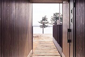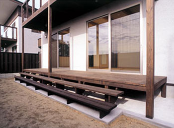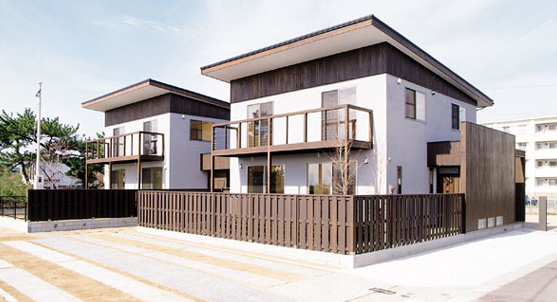 外観:建物全体が呼吸できるように考えシラスを主原料とした外壁材を使用。木との組み合わせにより柔らかいイメージを演出している。自然素材を利用したことで和風になりがちな外観を片流れの屋根を採用することでこの建物にしかない個性を強調した。またアプローチにも拘り、隣接する4棟の駐車場・玄関をお互いを感じ取れるようにプランニングして住戸間のコミニュケーションの提案も行っている。