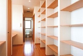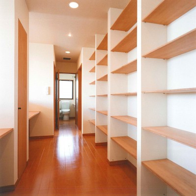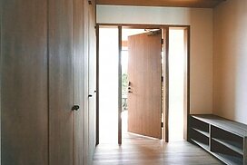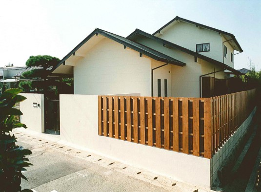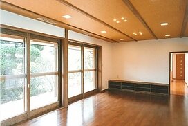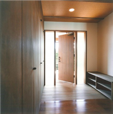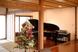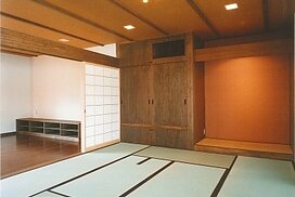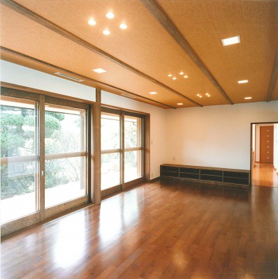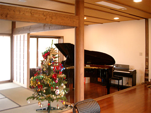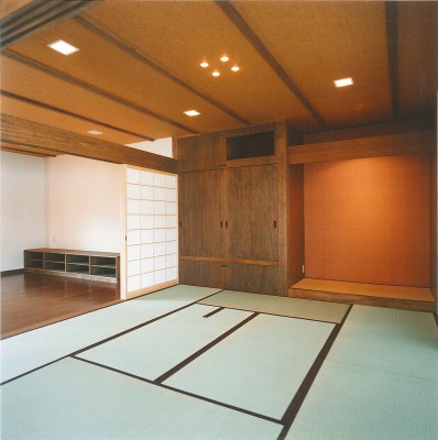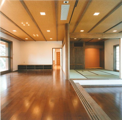 内部:塾の生徒達が遊びに訪れたり、茶道の仲間が集ったり、グランドピアノを囲んで気心知れた友人達と集える広間が欲しいということで「集い」と「家族」という大きく二つの空間に分けたプランニング。多くの人が集っていても家族のプライバシーは守れるよう検討した結果、出来上がった間取りである。仕上材も網代風の材料を使用するなどして演出を計っている。また家の使い方や家族構成を考慮して床暖房を布設している。