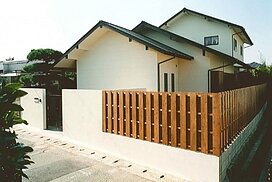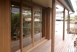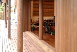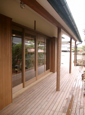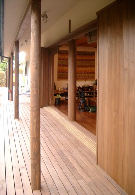 外観:この建物最大の魅力である長さ約20mの濡れ縁。アプローチの階段を上がった先に突如現れるこの空間に、このお宅をはじめて訪ねてこられた方全員が驚かれるそうだ。また靴を何処で脱いだらよいか分からず、訪ねられることもしばしばあるとのこと。狙い通り。。。アジアンリゾートというイメージを自分なりに噛みくだき実現した空間である。この濡れ縁は夏の日差しを遮るだけでなく、バーベキューなどの集いの空間になったり雨の日の物干し場と多岐にわたり活躍している。